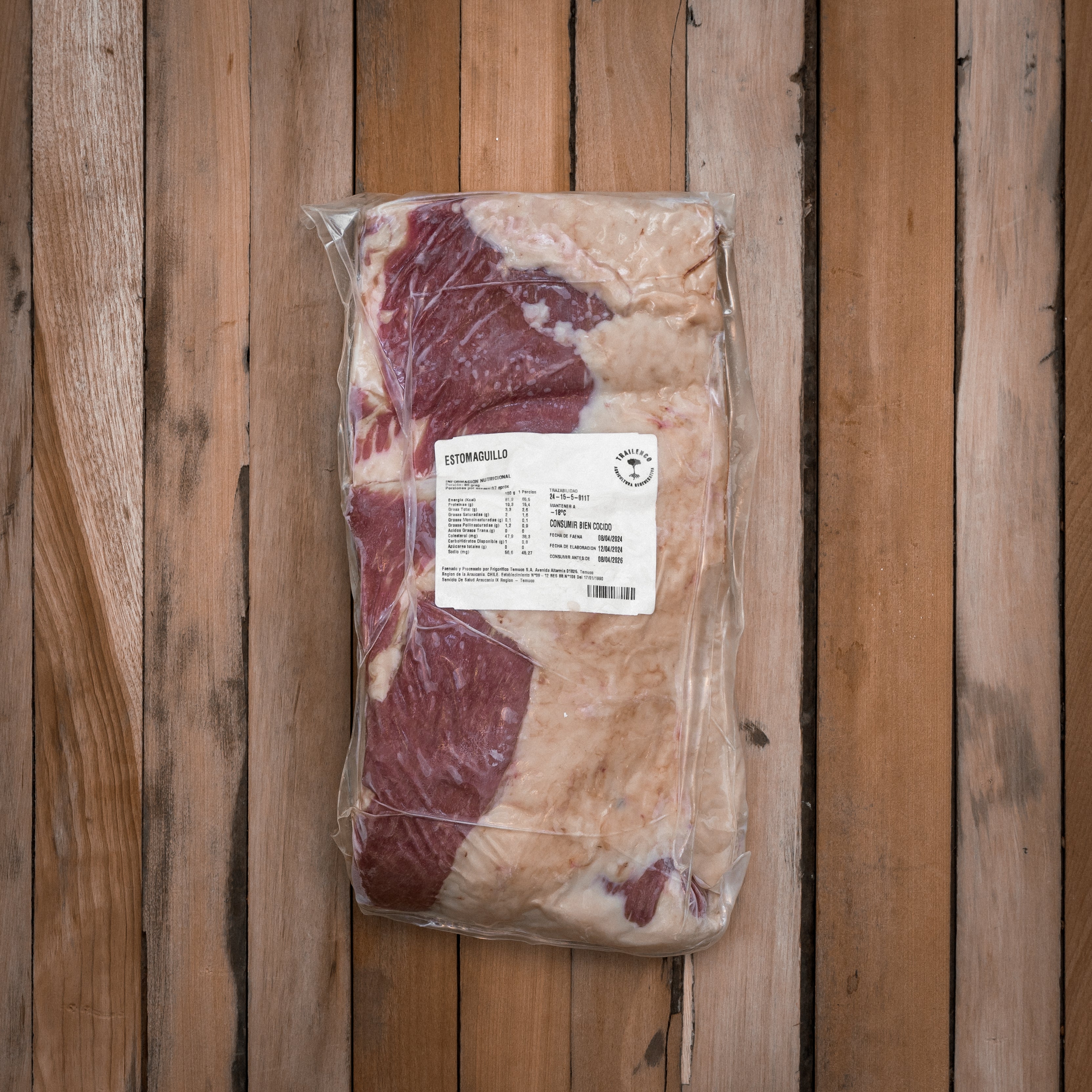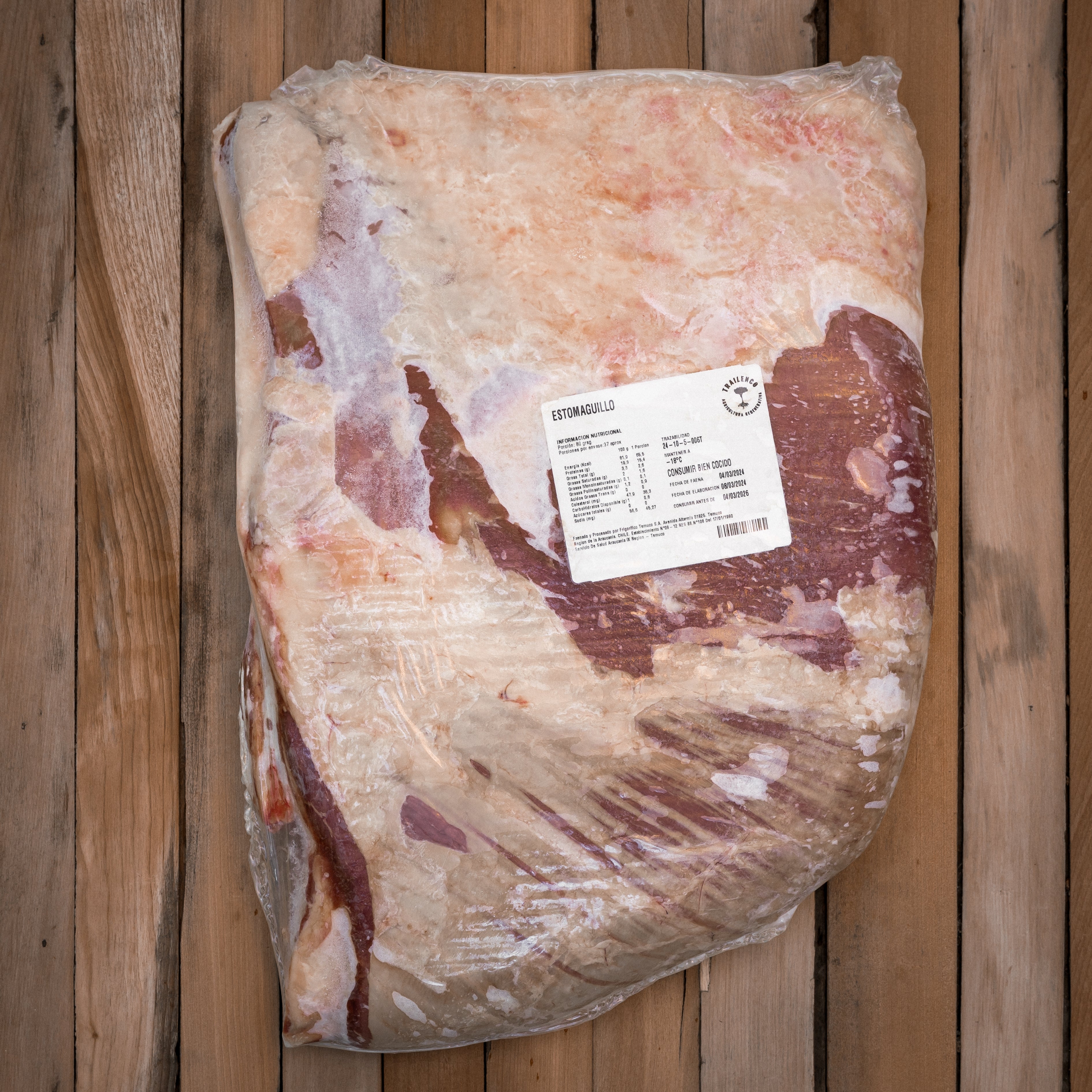 El Estomaguillo es un corte que contiene Tapabarriga y Coluda, además de huesos de la costilla del animal. Este corte tiene una cantidad significativa de tejido conectivo y grasa, lo que lo hace ideal para cocinar lentamente. Idealmente cocinarlo al fuego por varias horas, puede ser en parrilla o al palo.