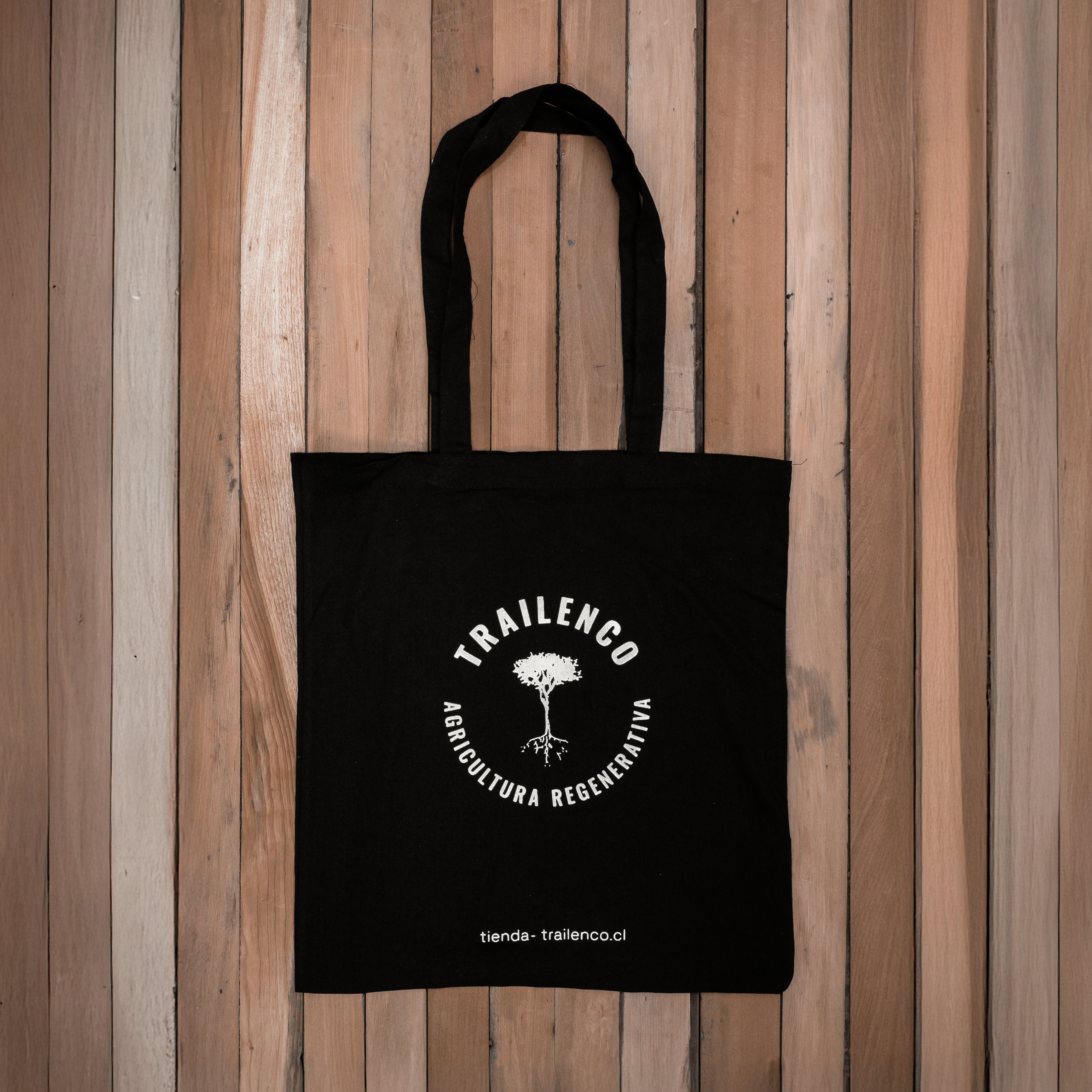 Una Totebag para tu día a día. Color negro y estampado en blanco, donde puedes llevar tus cosas donde quieras. Unete a la comunidad Trailenco.